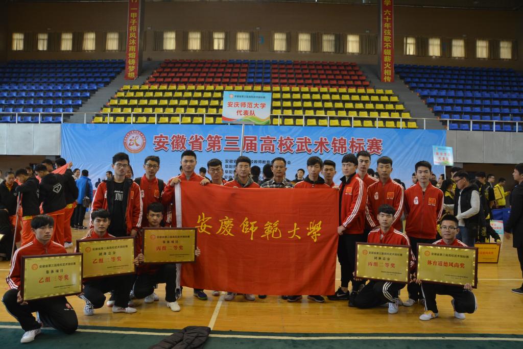 2017年11月11至12日,由安徽省高等院校教师教育合作委员会举办的安徽省第三届高校武术锦标赛在阜阳师范学院举行。经过顽强拼搏,我校2017级体表专业宫动宾同学获得男子丙组长拳一等奖、李帅强同学获得二等奖、卢洪宇同学获得三等奖;丙组太极拳获得两个三等奖、乙组太极拳一个三等奖;丙组集体项目二等奖,乙组集体项目三等奖、团体总分二等奖,同时被评为道德风尚奖,实现了运动竞赛和精神文明双丰收。