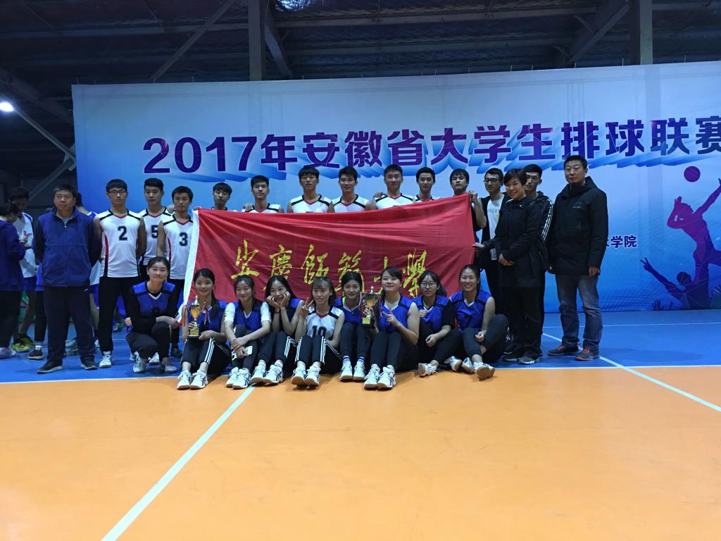 11月5日—21日,2017年安徽省大学生排球联赛在巢湖学院体育馆举行。我校排球队在李斌、邓龙、闻又文等老师的带领下,分别参加了本次比赛男、女丙组(体育专业组)和男、女甲组(普通高校组)的比赛。最终体育专业组男、女排球队分别获得二等奖,普通高校组男、女排球队分别获得三等奖;另外,体育专业组和普通高校组排球队均获得了“体育道德风尚奖”;梅冠东、解玉凯、韩雨秋、刘方方、李国栋、赵立明、倪良文,覃观青等16位同学获得“体育道德风尚奖”运动员称号。