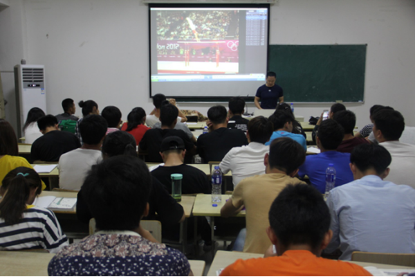 2017年5月11号晚,英国正版365官方网站吴海鸥副教授在体育馆多媒体教室做学术讲座,主题为“新周期国际竞技体操男子规则和裁判法”系列讲座之一——双杠理论与实践。2016级体育教育专业全体同学等80多人参加讲座。