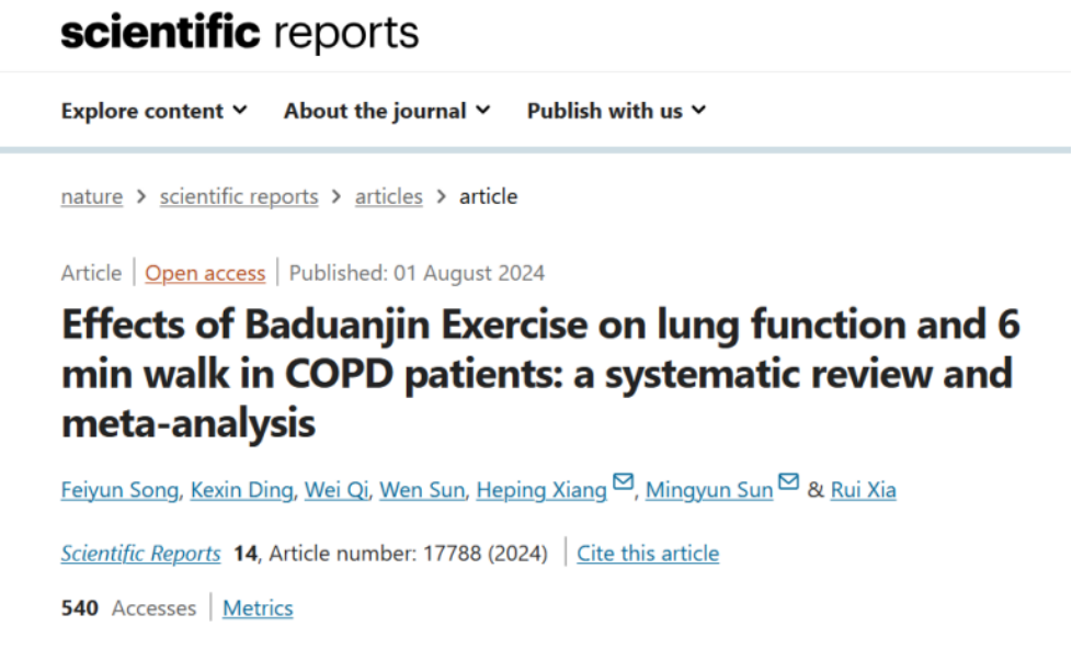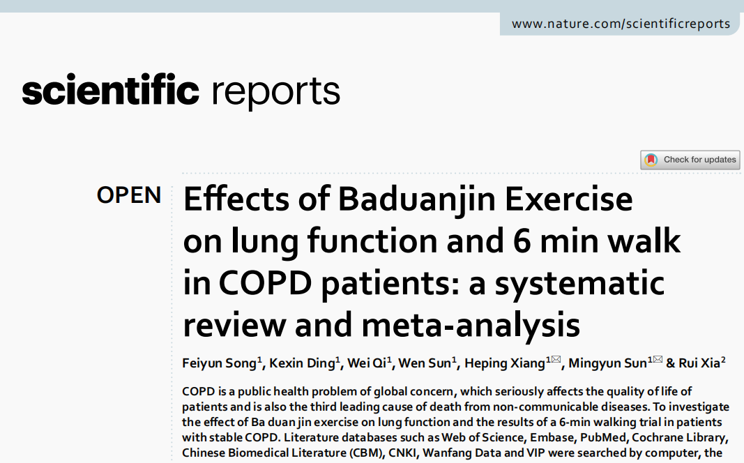 近日,英国正版365官方网站孙明运教授指导的宋飞云等研究生组成团队,在国际高水平期刊《Scientific Reports》(JCR一区/中科院二区期刊)发表了题为“Effects of Baduanjin Exercise on lung function and 6 min walk in COPD patients: a systematic review and meta-analysis”的论文,安庆师范大学为论文第一完成单位和通讯单位。《Scientific Reports》(IF=4.6)作为Nature 旗下的期刊,发表来自自然科学、心理学、医学和工程学等多个领域,致力于关注具有新颖性和示范性的原创研究。该刊作为全球第五大被引用期刊,所发表论文在学术界具有较高的认可度和影响力。