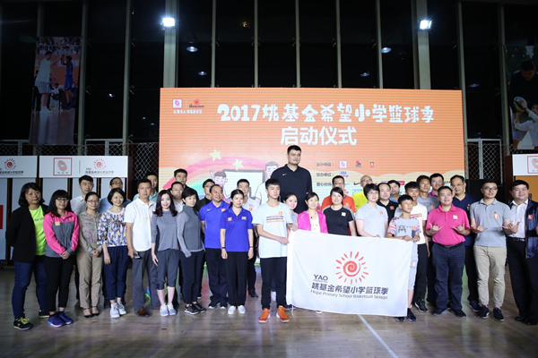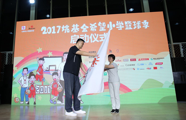 5月22日晚 ,“2017姚基金希望小学篮球季”在北京NBA姚明篮球俱乐部正式启动。姚基金创始人姚明代表主办方为2017全国集训及联赛承办城市南京市授旗并与嘉宾合影。中国青少年发展基金会理事长王剑、副秘书长杨春雷以及爱心企业代表、高校代表、支教志愿者代表、项目受助乡村小学代表等共同出席了本次活动。