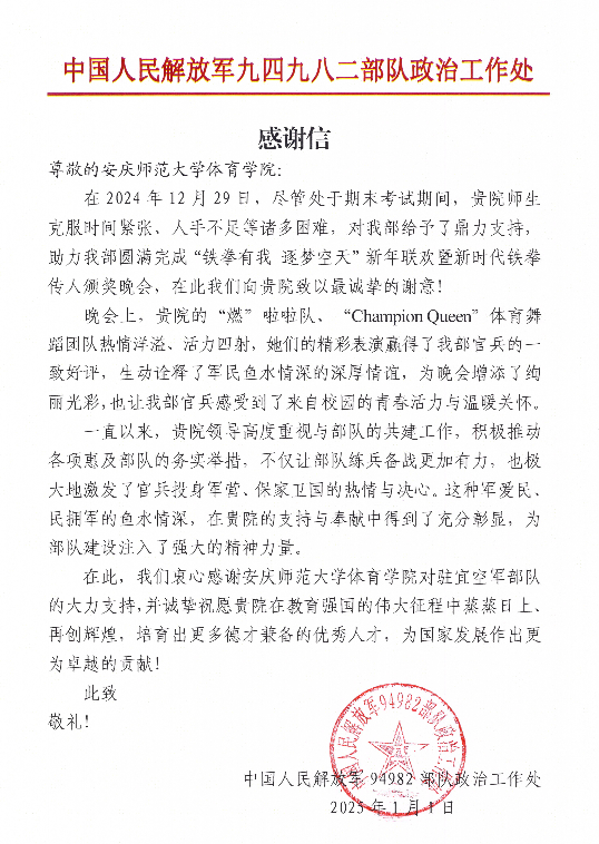 英国正版365官方网站副院长王晓东出席了此次晚会,与师生共同见证这一军民团结的温暖时刻,也激励着学院在未来的军民共建与人才培养道路上不断前行,持续为军地融合发展贡献力量。部队为此特向学院发来感谢信,对学院的大力支持与同学们的精彩表现给予高度赞誉和诚挚感谢。