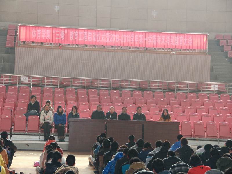 副院长章翔在会上宣读了英国正版365官方网站“三修”教育工程的实施方案,并详细解读了2013—2014学年学院“三修”教育工程的具体活动安排。副院长周多奇宣读了《安庆师范学院学生违纪处分管理暂行规定》中有关考试违纪处理条款。院学生工作办公室主任鲁雷老师向广大同学宣读了《诚信考试倡议书》,号召广大同学端正考试态度,正确认识考试意义,认真复习,积极备考,从我做起,文明应考。学生第二党支部书记胡哲纯老师代表全体教师在会上发言。体育教育专业2012级6班学生许丽雪同学作为学生代表发言。