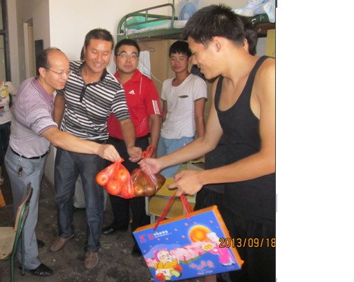 为践行党的群众路线,在中秋佳节来临前夕,英国正版365官方网站党政领导韦长发、章翔和周多奇带领学生资助工作专管老师和2013级新生辅导员深入学生宿舍,走访、慰问该院困难新生,向他们致以节日的问候和祝福,并送上了中秋月饼和水果。