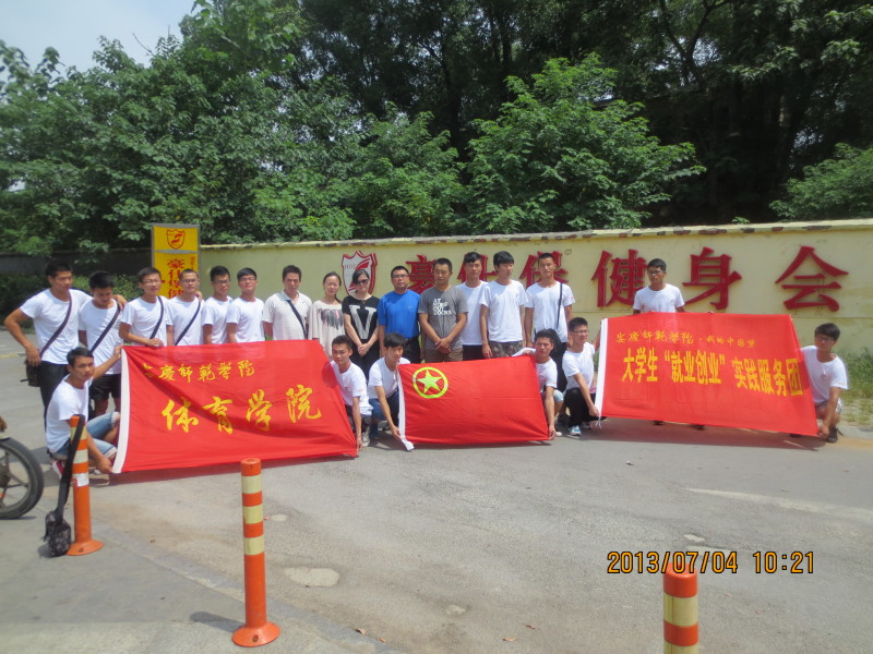 为了让学生在实践中成长成才,在学院党总支的领导下,结合专业特长和社会需要,7月4日上午,由副院长章翔亲自甄选的英国正版365官方网站2012级体育教育专业16名卓越班的同学,组建成“英国正版365官方网站2013年暑期创业见习服务团”,在章院长和学院学生工作办公室主任兼卓越班辅导员鲁雷老师的带领下,奔赴安庆市豪仕堡健身会所开展暑期社会实践活动,并在安庆市豪仕堡健身会所举行了活动启动仪式。