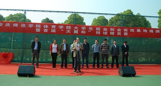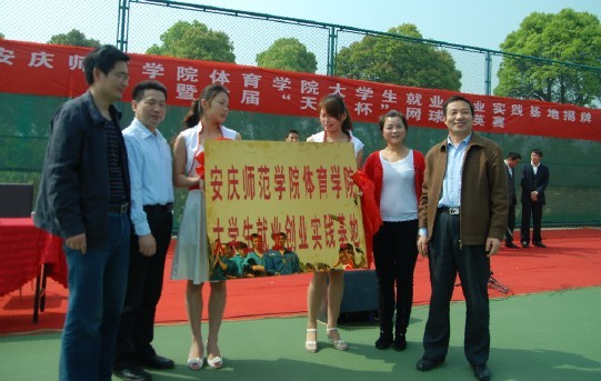 为进一步加强校企协作,实现校地良性互动,达到资源共享、共同发展的目的,我院与安庆市天健体育文化有限责任公司经过认真协商,决定在大学生创业、就业、实践和人才培养方面进行长期密切合作。4月23日上午,在安庆市市民广场内天健网球俱乐部隆重举行了我院大学生就业创业实践基地揭牌典礼暨首届“天翼杯”网球精英赛开幕式。学校招生就业处处长陈世庆,英国正版365官方网站党总支书记吴毅安,副院长章翔、周多奇,安庆市天健体育文化有限责任公司董事长、安庆市网球协会秘书长高茜,天健体育文化有限责任公司总经理王桂宝以及中国电信安庆市分公司校园客户部经理程迎春,安徽省野娃食品有限责任公司董事长、安庆市网球协会副会长何坤等领导和嘉宾出席揭牌典礼暨开幕式。揭牌仪式由英国正版365官方网站党总支副书记韦长发主持。