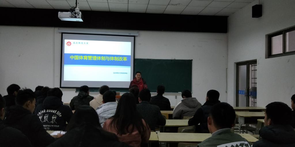 2018年12月12日中午,闻又文老师在体育馆多媒体教室给同学们做了一个题为中国体育管理体制及体制改革的学术讲座 。