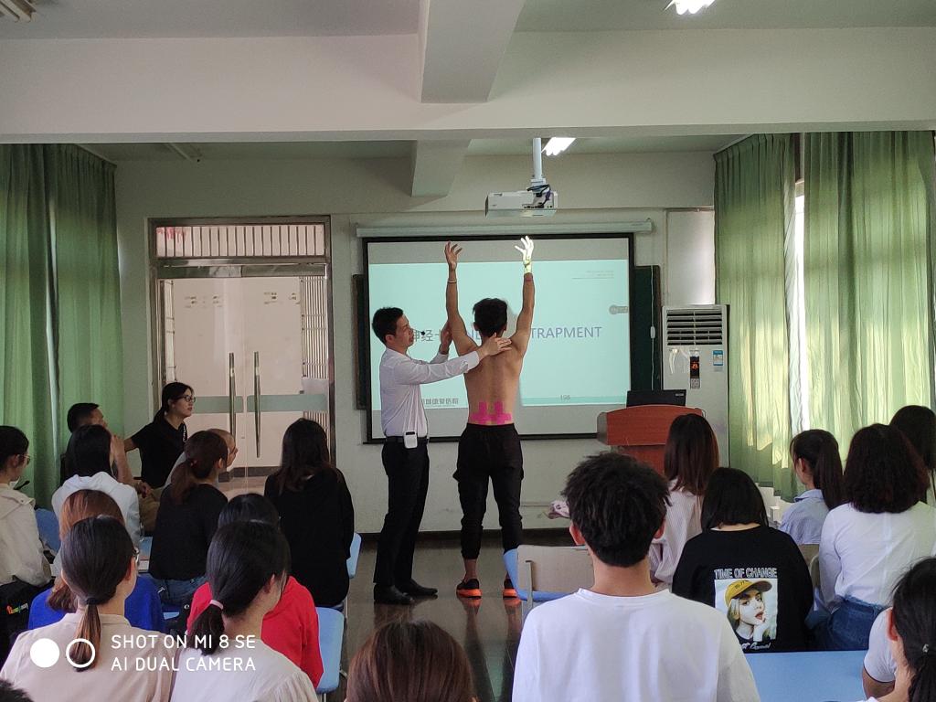 报告会分两天举行,第一天报告会上,廖教授首先与同学们分享了肌肉骨骼康复“重置、强化、重载”的3R理念,接着介绍功能性贴布的起源与发展;重点讲述功能性贴布治疗的理论基础、临床治疗的适应征和禁忌征;最后详细讲述了功能性贴布在疼痛、姿势纠正、神经卡压和水肿四个方面应用的理论基础和操作的注意事项,并逐一进行现场演示。第二天的报告会,廖教授主要讲授身体各部位的贴扎,首先介绍身体各部位常见的运动损伤及损伤机理,并传授和现场演示各部位的物理检查与评估,最后进行贴扎操作演示。报告会结束之际,廖教授从运动康复专业角度出发,与师生共同探讨了肌肉骨骼康复的发展,对我校运动康复专业的发展提出合理建议,也对全体运动康复专业学生提出了殷切的期望。