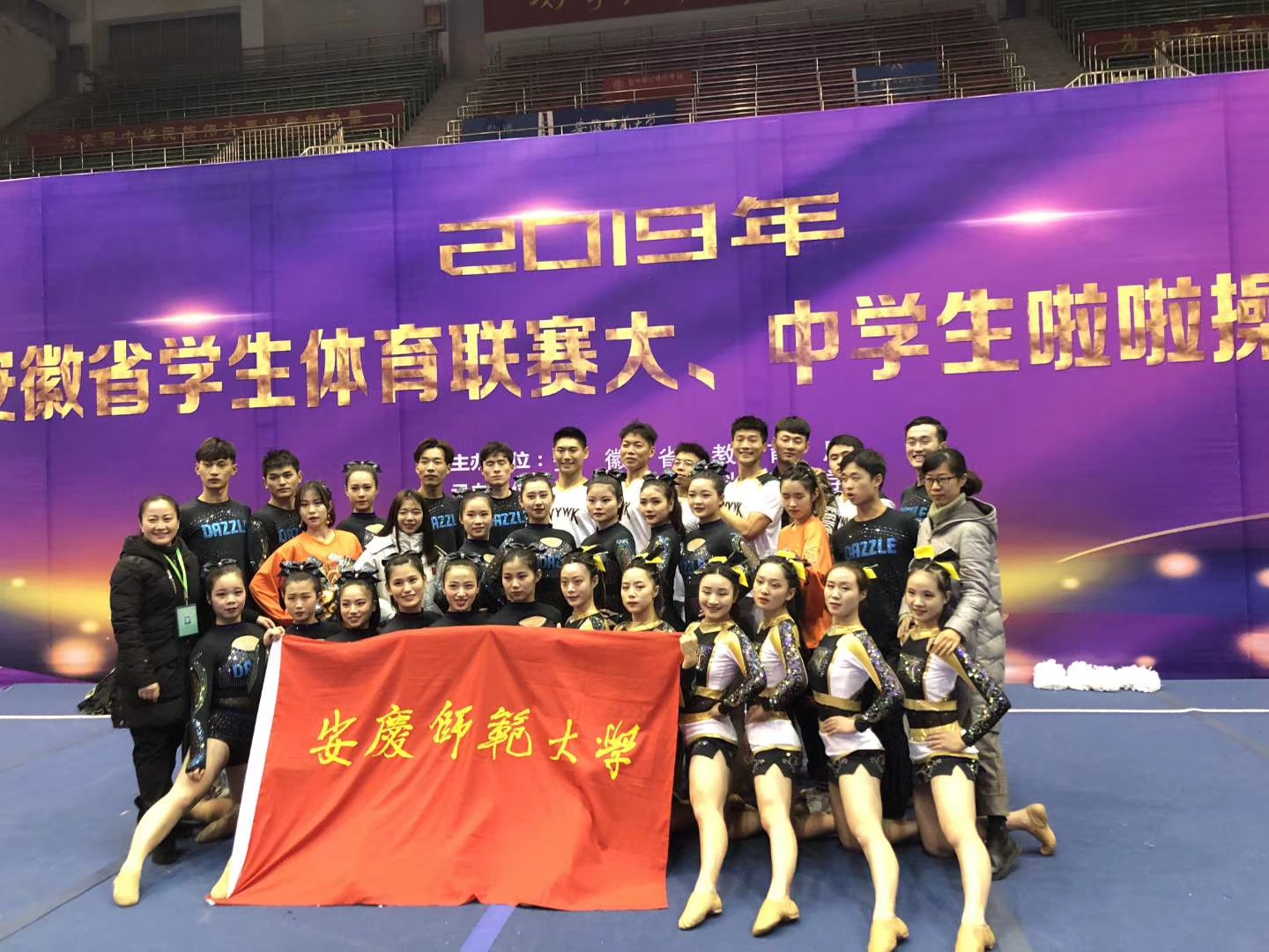 12月22--25日,由安徽省教育厅举办,安徽医科大学承办,安徽省学校体育卫生协会协办的“2019年安徽省学生体育联赛大、中学生啦啦操比赛”在安徽医科大学举行。来自全省各地22所高校、10所大专院校和10所地市中学,共计1107名运动员参加比赛。我校啦啦操队在潮芳、陶学菲两位老师的带领下,参加了大学甲组三个项目和大学丙组两个项目的比赛,最终获得大学甲组花球自选金牌、花球示范套路银牌、街舞自选第四名;大学丙组花球示范套路第四名和街舞自选第三名。