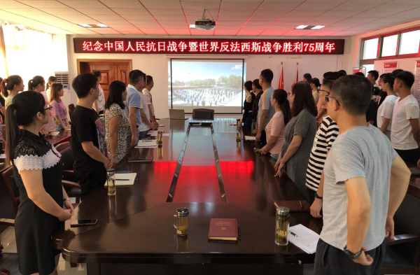 “起来,不愿做奴隶的人们……,我们万众一心,冒着敌人的炮火,前进,前进,前进,进!”体育馆会议室内回荡着我院师生齐声高唱国歌的声音。国歌唱毕,全场肃立,向在中国人民抗日战争中英勇牺牲的烈士默哀。