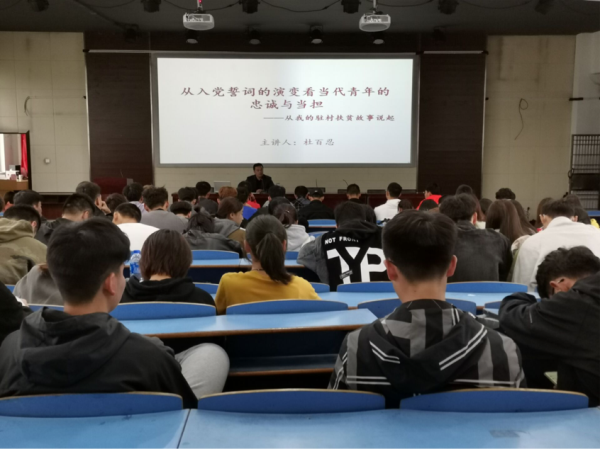 杜百忍老师以“从入党誓词的演变看当代大学生的忠诚与担当——从我的驻村扶贫故事说起”为主题,向大家讲述了何为忠诚与担当,当代学生党员如何践行初心和使命。报告以扶贫过程中的点滴小事为切入点,以小见大,向大家宣传了国家的扶贫政策和措施,让大家更直观、更深入的熟悉和了解了党和国家扶贫政策以及扶贫干部的辛苦与不易。