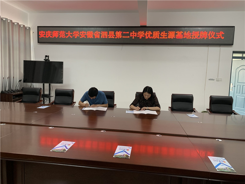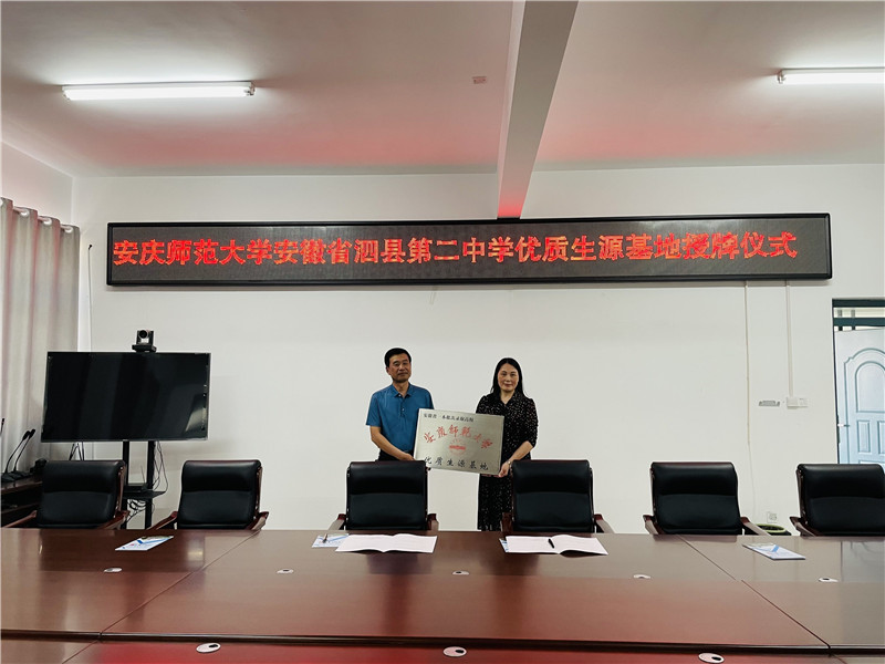 林秋菊一行与优质生源基地学校校长、教导主任等进行座谈,就我校办学历史、发展成就、办学特色、专业设置、招生就业等方面进行介绍。双方就往届高中毕业生报考我校情况、2021届高三年级学生整体情况进行深入交流。各校领导、老师纷纷表示:安庆师范大学作为省内影响力大、办学特色鲜明、教科研实力较强的百年老校,对考生的吸引力大,一定会积极宣传和动员考生踊跃报名,争取有更多的优秀学子能考入安庆师范大学,同时也希望我校培养更多的优秀人才回家乡发展。座谈结束后,双方领导举行“优质生源基地”签约及挂牌仪式。