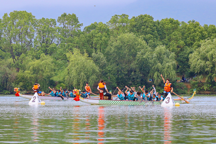 此次比赛共有来自各学院的15支代表队参与。180余名龙舟运动员竞舟于校内双龙湖上,开展了8场激烈的水上竞技比拼,在“速度与激情”中走近传统文化,在追求“更高、更快、更强”的拼搏中彰显“敬敷、世范、勤学、笃行”的校训精神。赛中,参赛者们身穿各色队服,口中高喊队伍口号,随着鼓声不断统一手中桨频,一同高举、深推船桨出入水面,划推龙船在300米长的水道中迅速前行。