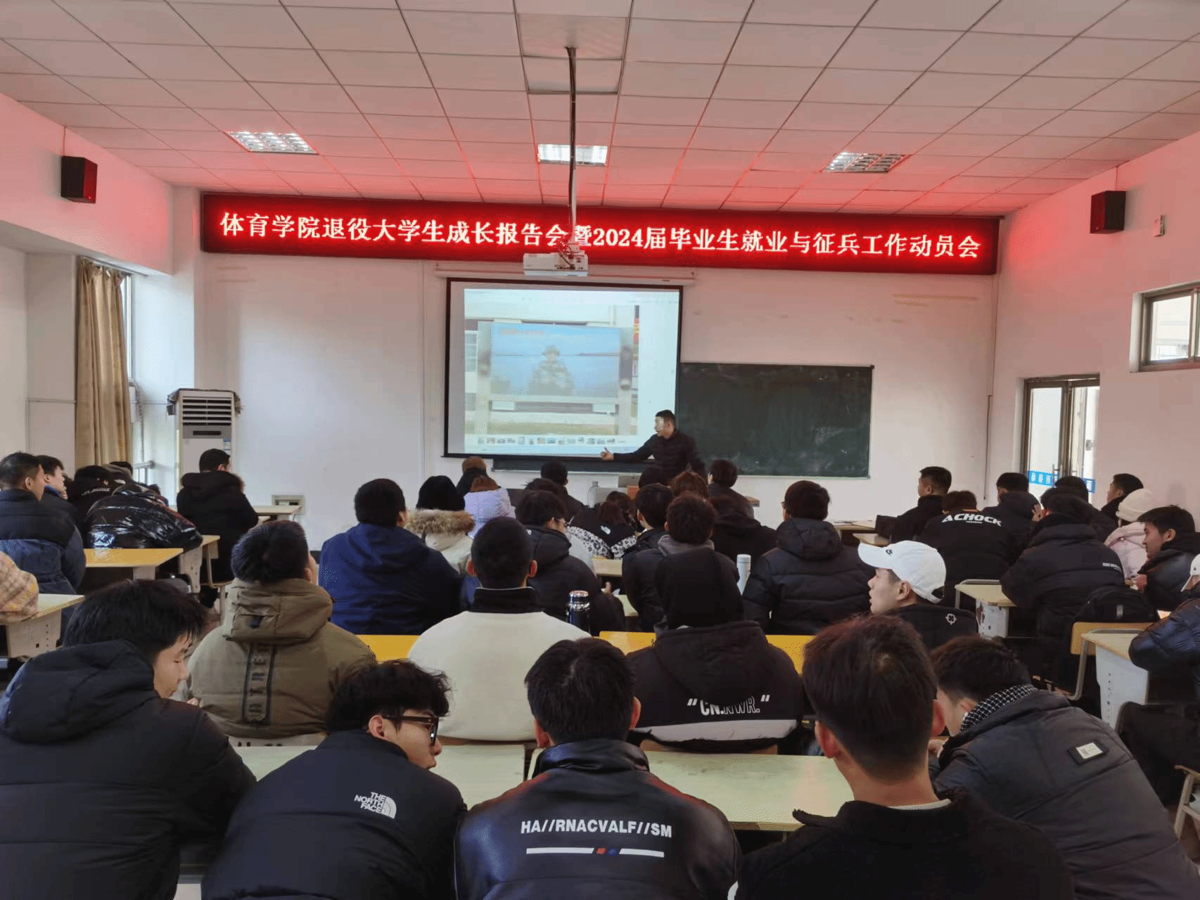 12月25日上午,英国正版365官方网站在体育馆多媒体教室举办退役研究生成长报告会暨2024届毕业生就业与征兵工作会。学院党委副书记王玮、毕业班辅导员老师出席会议,学院全体体教专业毕业班学生参加了会议。会议由毕业班辅导员老师、征兵工作负责人程启平老师主持。