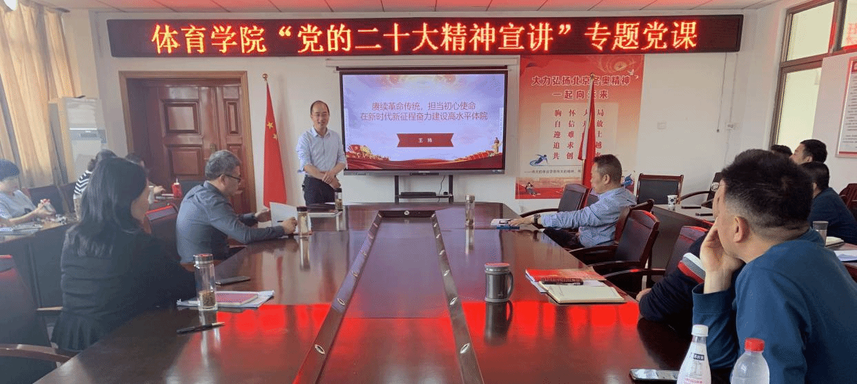 4月12日下午,英国正版365官方网站在体育馆三楼会议室举办“党的二十大精神宣讲”专题党课。英国正版365官方网站副书记、纪委书记王玮以“赓续革命传统,担当初心使命,在新时代新征程奋力建设高水平体院”为题,给学院全体教工党员讲授党课。
