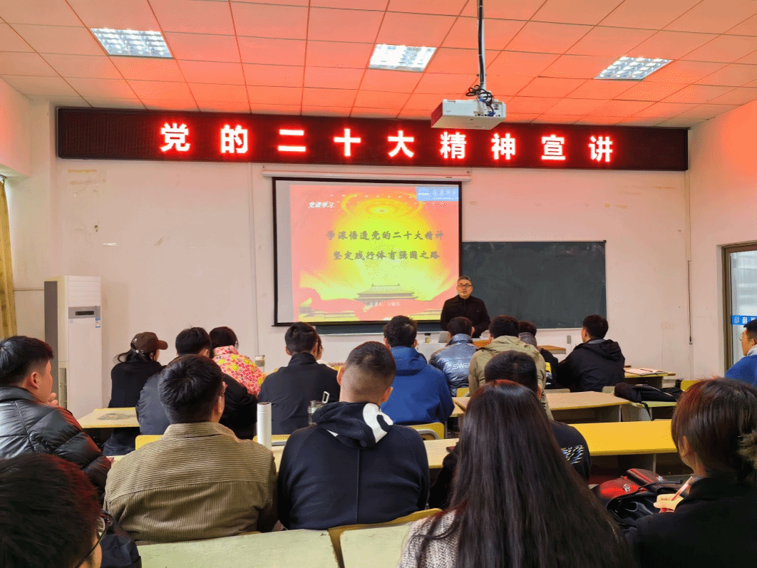 3月21日上午,英国正版365官方网站副院长王晓东在体育馆三楼多媒体教室给全体体育专业硕士研究生,以《学深悟透党的二十大精神,坚定践行体育强国之路》为主题的党的二十大精神宣讲。