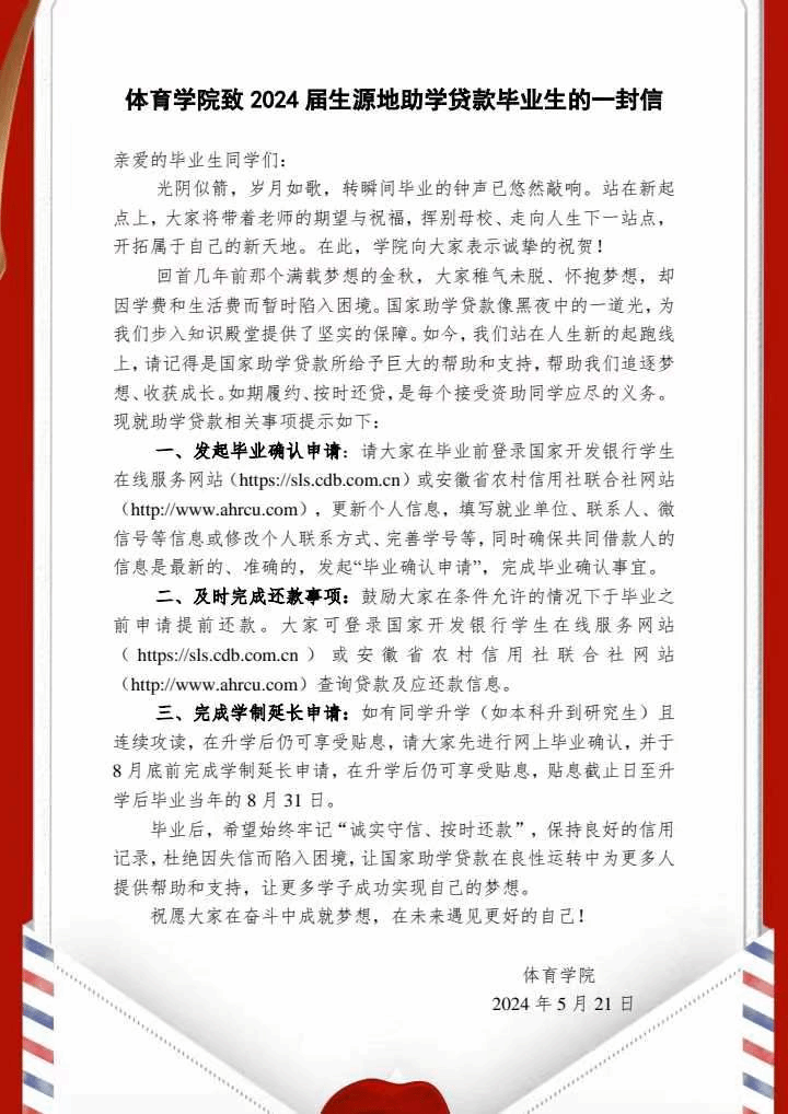 学院紧扣毕业季等重点时段,分析不同年级资助工作重点,针对毕业生资助诚信可能存在的难点问题,撰写并发布《体育学院致2024 届生源地助学贷款毕业生的一封信》。信中表达了学院对贷款毕业生的关心和爱护,就毕业确认、贷款还款和办理学制延长申请等事宜进行了详细介绍,将诚信教育贯穿于毕业生文明离校教育中,强化对诚信意识、法律意识和契约精神的宣传。各毕业生班级、寝室纷纷组织学习,贷款毕业生按照要求进行操作,确保毕业生生源地贷款确认工作落实到位。