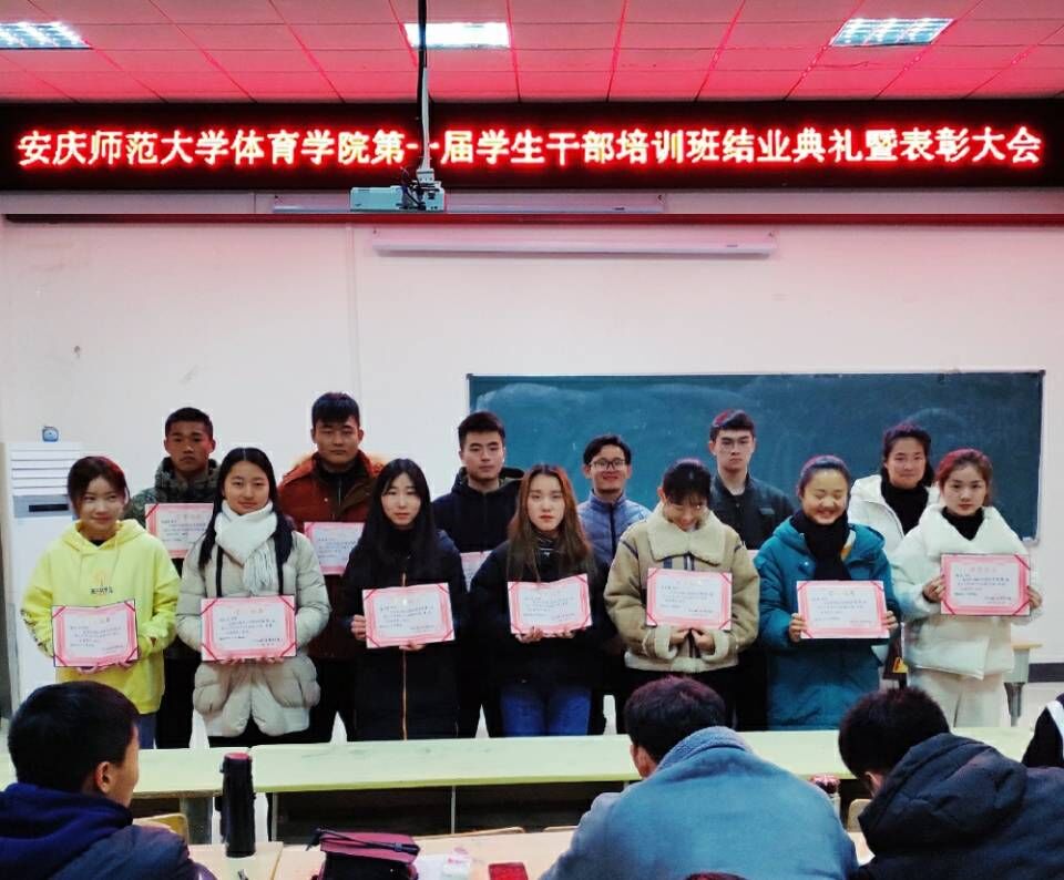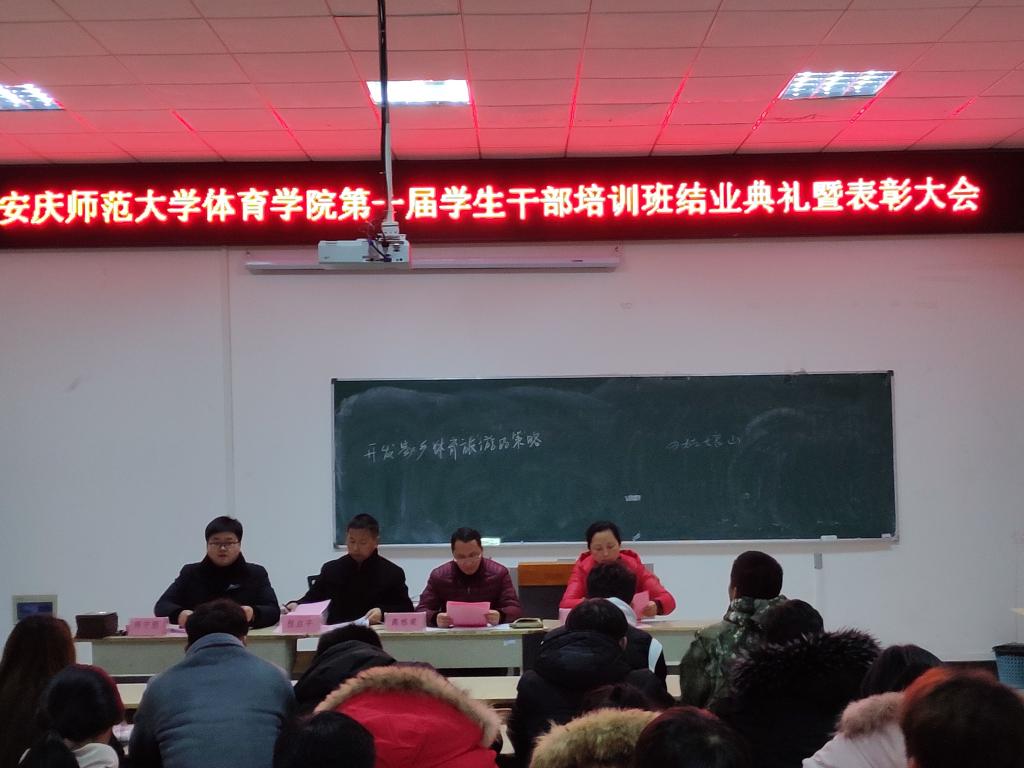 1月3日晚上,体育学院举行第一期学生干部培训班结业典礼暨表彰大会。学院党委副书记高栋梁、专职辅导员程启平、沈春华和陈守朋出席典礼,第一期培训班顺利结业的49名学员参加了典礼。