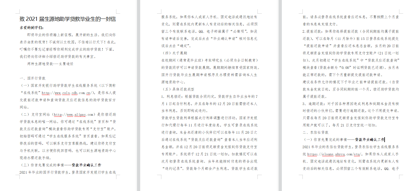为保证生源地信用助学贷款持续健康的发展,学院组织了2021年毕业的学生贷款确认工作。学院资助老师将《致2021届生源地助学贷款毕业生的一封信》转发给学院专兼职辅导员,并下发至各班级群中,并确保每一位同学都收到有关消息。生源地信用助学贷款学生毕业确认工作,有助于确保生源地贷款的按时回收,加强学生对国家助学贷款及其他资助政策的了解,培养学生们守信做人、心怀感恩、勇担责任的意识。