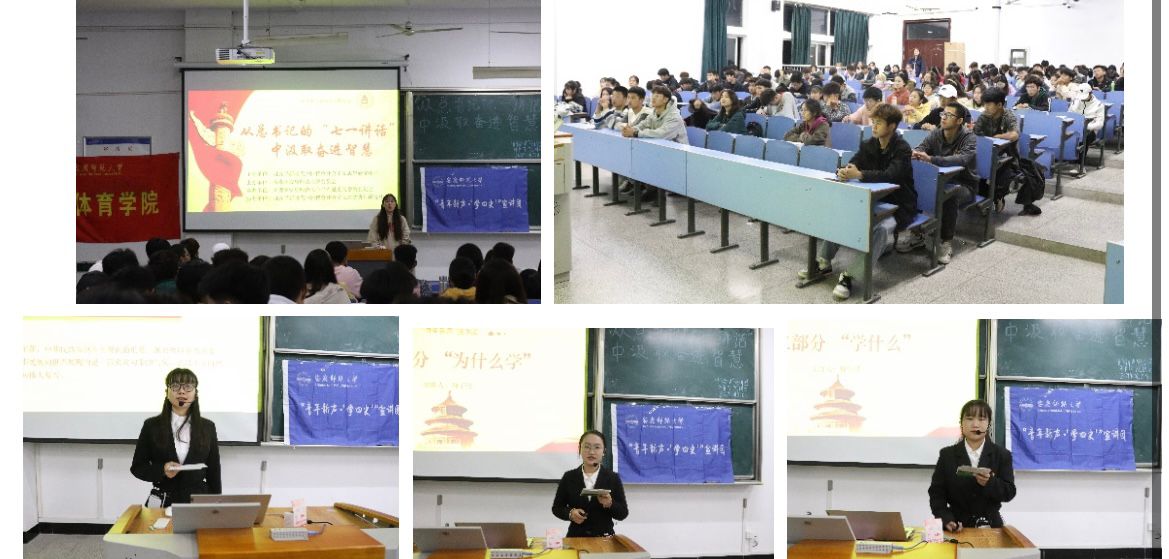 10月22日,校“青年新声”宣讲团来体育学院做了题为“从总书记的‘七一讲话’中汲取奋进智慧”的宣讲。宣讲团成员学科思政2021级研究生黄源靖和思想政治教育专业2020(2)班项子佳和唐佳慧分别做了具体宣讲,学院全体2021级新生聆听了宣讲。