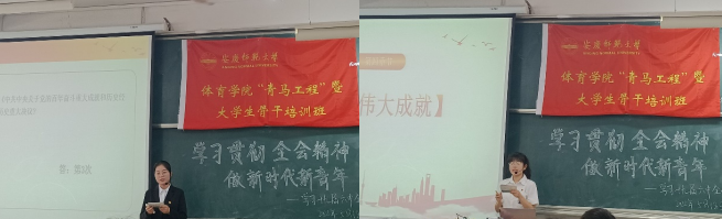 由宣讲人孙荣带来的有关十九届六中全会的知识提问环节揭开了此次宣讲的序幕。孙荣以12345这5个数字对“一个主题”“两个确立”“三大历史性飞跃”“四个伟大成就”“党的百年奋斗的五个历史性意义”等内容进行系统性讲解,叙说了党在新中国成立之初、1978年十一届三中全会、中国特色社会主义进入新时代等具体的时间节点中的历史事件和马克思主义中国化的百年发展历史。场下学生们积极举手、参与回答。