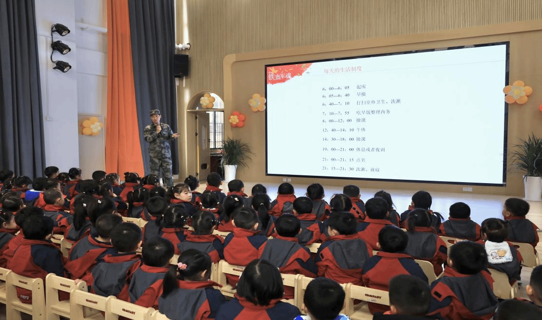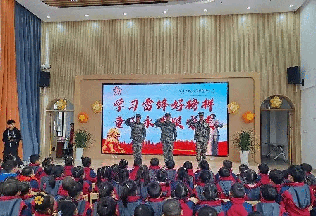“小朋友们知道雷锋叔叔吗?”“解放军叔叔!”3月3日,安庆师范大学附属龙城幼儿园的礼堂里格外热闹,场内的互动让“雷锋”成为话题焦点。120名小朋友跟随安庆师范大学7位体育教育专业学生的脚步,站起了军姿,练上了军体拳。3名身着迷彩服的退伍大学生登上舞台,讲雷锋精神,聊军旅生活,孩子们端正坐姿,听得入神。