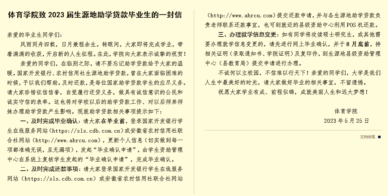 “奋斗是青春最亮丽的底色,行动是青年最有效的磨砺”。作为青年学生,应当有责任、有担当,用智慧和汗水共筑中国梦;作为家庭经济困难的学生,更应该明白,诚信乃立身之本,诚信还贷是对党和国家资助政策的回报,也是检验自身诚信为人的重要指标。为切实做好我院2023届贷款毕业生的贷后管理工作,帮助贷款学生树立诚信还贷意识,学院撰写并发布了《英国正版365官方网站致2023 届生源地助学贷款毕业生的一封信》,就毕业确认、贷款还款和办理就学信息变更等事宜进行了详细介绍,将诚信教育贯穿于毕业生文明离校教育中,强化对诚信意识、法律意识和契约精神的宣传。