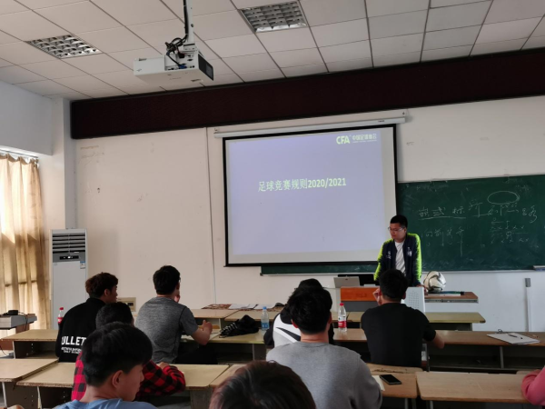 2021年4月23日下午14:30,我院乔伟老师在体育馆多媒体教室为大学生足球俱乐部成员、校足球队队员作主题为“2020-2021足球竞赛规则”学术讲座。
