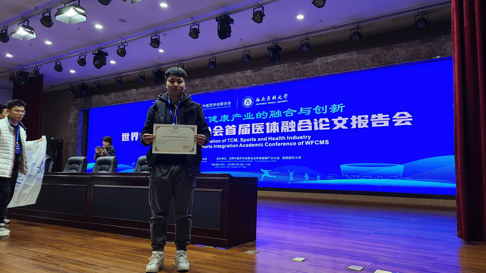2023年12月15-16日,世界中医药联合会首届医体融合论文报告会在西南医科大学隆重召开,世界中医药联合会医学专家、体育学专家、教授、研究生等共三百余人参加了本次盛会。我院师生孙明运教授、研究生漆巍受邀参加学术会议。