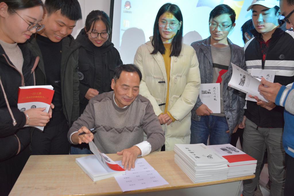 为给大学生党员、积极分子正确认识党的光辉历史,激发他们爱党、爱革命前辈的热情,朱洪教授精选了他的最新出版的作品《一门三杰——陈独秀和他的两个儿子》,现场签名赠书。赠书现场,同学们久久不愿离去,并纷纷与朱教授合影留念。
