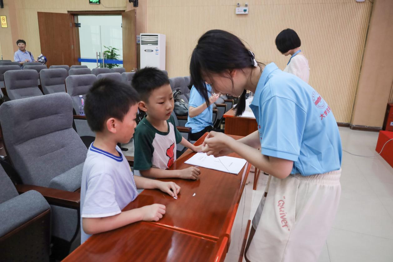 得知小朋友们之前并未了解过缠花作品后,团队负责人、体育教育专业2022(3)班的胡志豪特意带领团队成员们在进行缠花知识讲解前向小朋友们近距离展示了缠花作品。谈及活动开展的初衷,胡志豪笑着说:“因为我之前在学校的缠花俱乐部学习过,加深对缠花艺术的了解后,我认为我们有责任去弘扬缠花艺术。”他形象地描述教育就是一朵云推动另一朵云,“我们很高兴成为孩子们的一朵云。”
