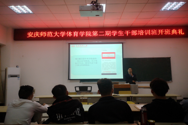 11月6日晚,我院在体育馆多媒体教室举行了第二期学生干部培训班开班仪式。英国正版365官方网站党委副书记高栋梁、团委副书记陈守朋、专职辅导员储著奇出席开班仪式,团委和学生会主要学生干部、2019级全体班干共计60余人参加培训。