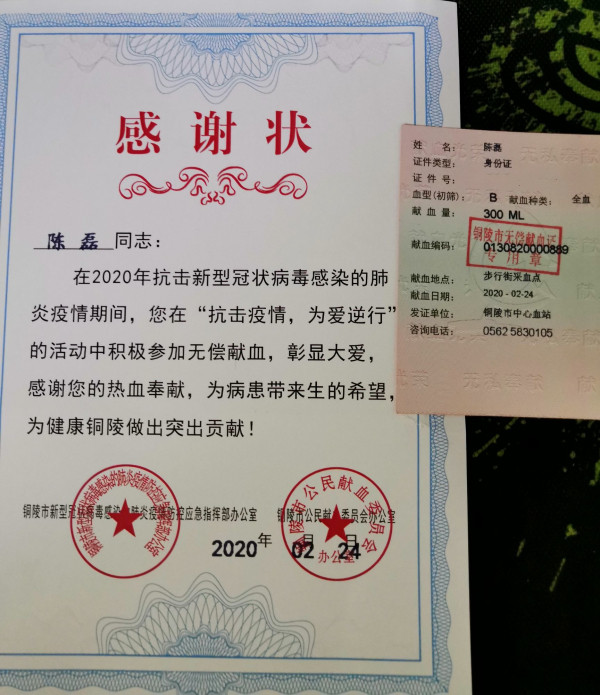 2月24日傍晚,在安徽省铜陵市中心血站内,体育表演专业2018级(1)班的陈磊赶上了当天献血的末班车。“家人们一直阻止我来献血,我是偷偷跑出来的,作为一名正在向党组织靠拢的青年团员,我有责任前来支援。”