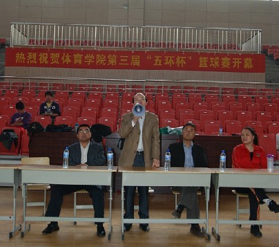 伴随着礼炮声,我院第三届“五环杯”篮球赛的揭幕战—— 07级篮球专选班代表队对阵08级篮球专选班代表队随即精彩上演,副院长周多奇为首场比赛开球。
