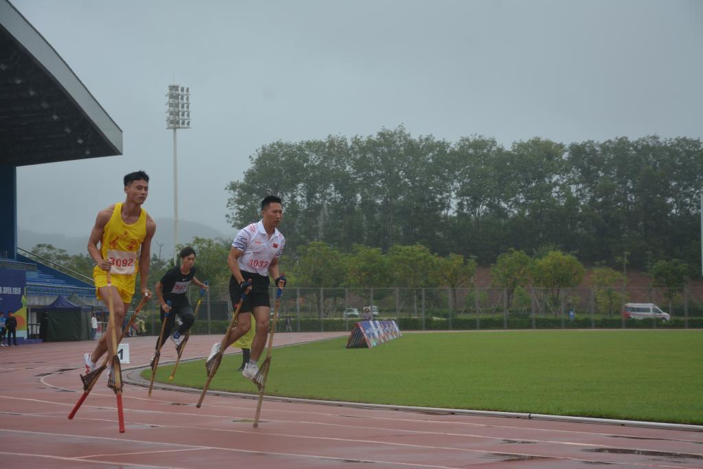 赛场上,我校选手脚踩35厘米高的高脚马,手握竹竿,在百米跑道上奔跑,充分展示出超强的灵活性、协调性和平衡性;三人一组的板鞋竞速赛中,我校选手脚踩板鞋整齐划一地冲向终点,团结一致、相互扶持的精神赢得现场观众阵阵掌声,展示了安徽形象,为安徽省争得了荣誉。